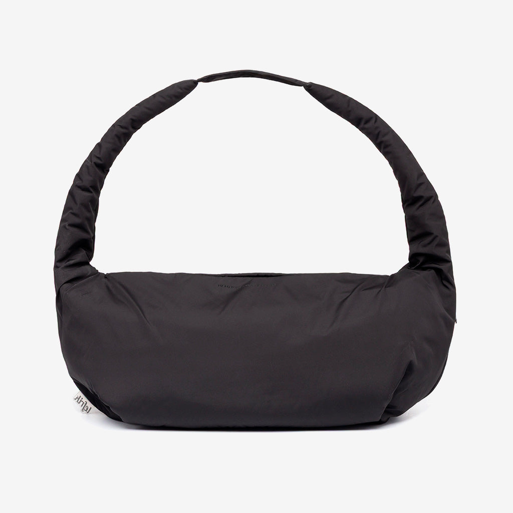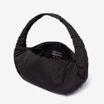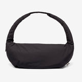 Soft shoulder bag with a seamless circular handle and a rounded design. Made from a 100% recycled smooth and subtly textured fabric. It closes securely with a zipper at the top, ensuring your belongings stay safe. Inside, you'll find a convenient inner zipper pocket for added organization.