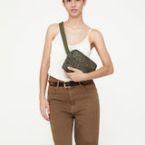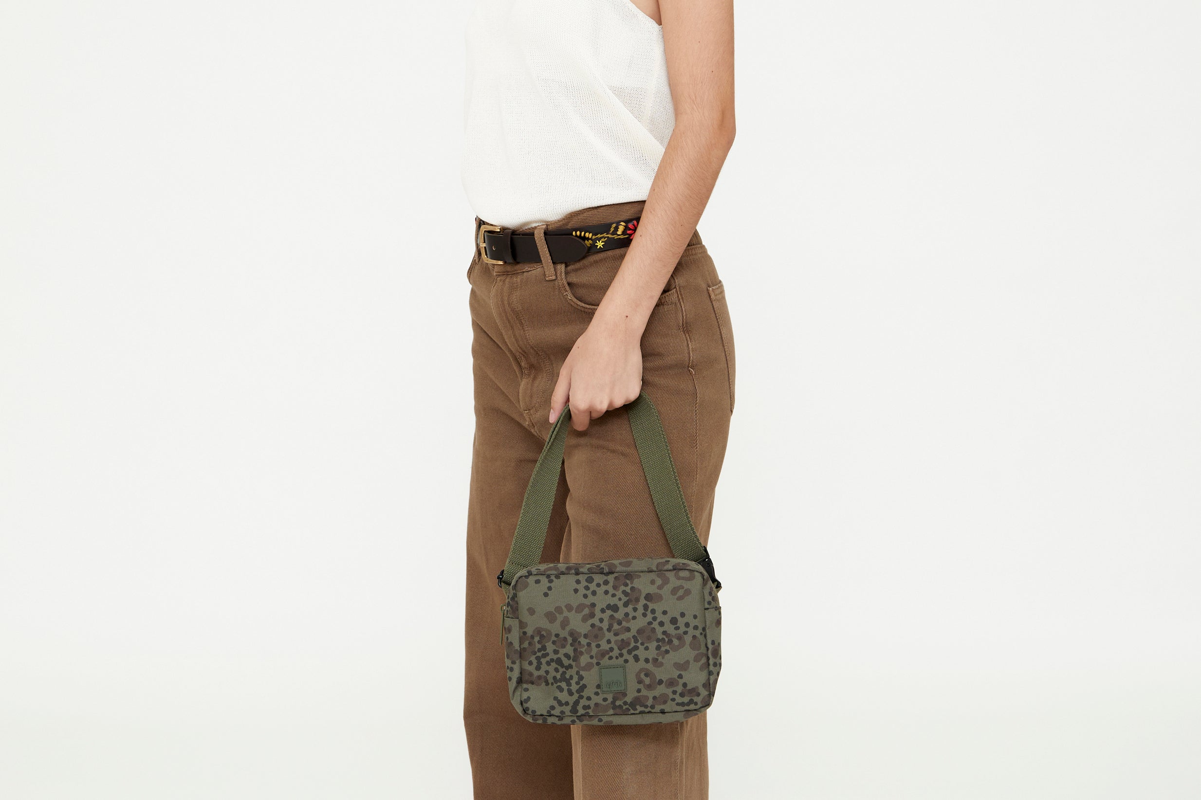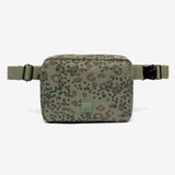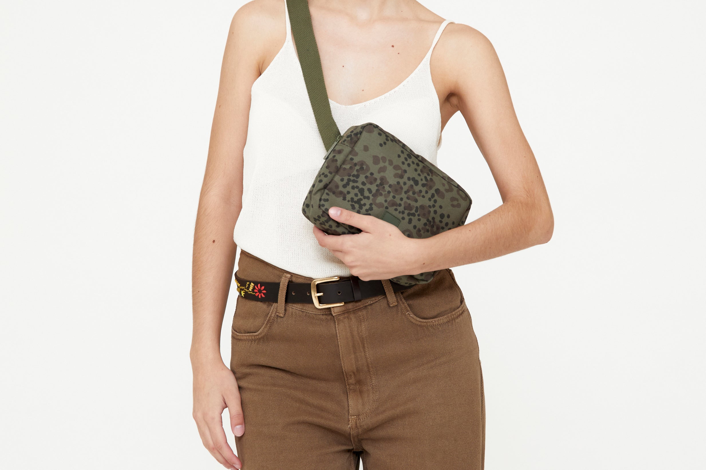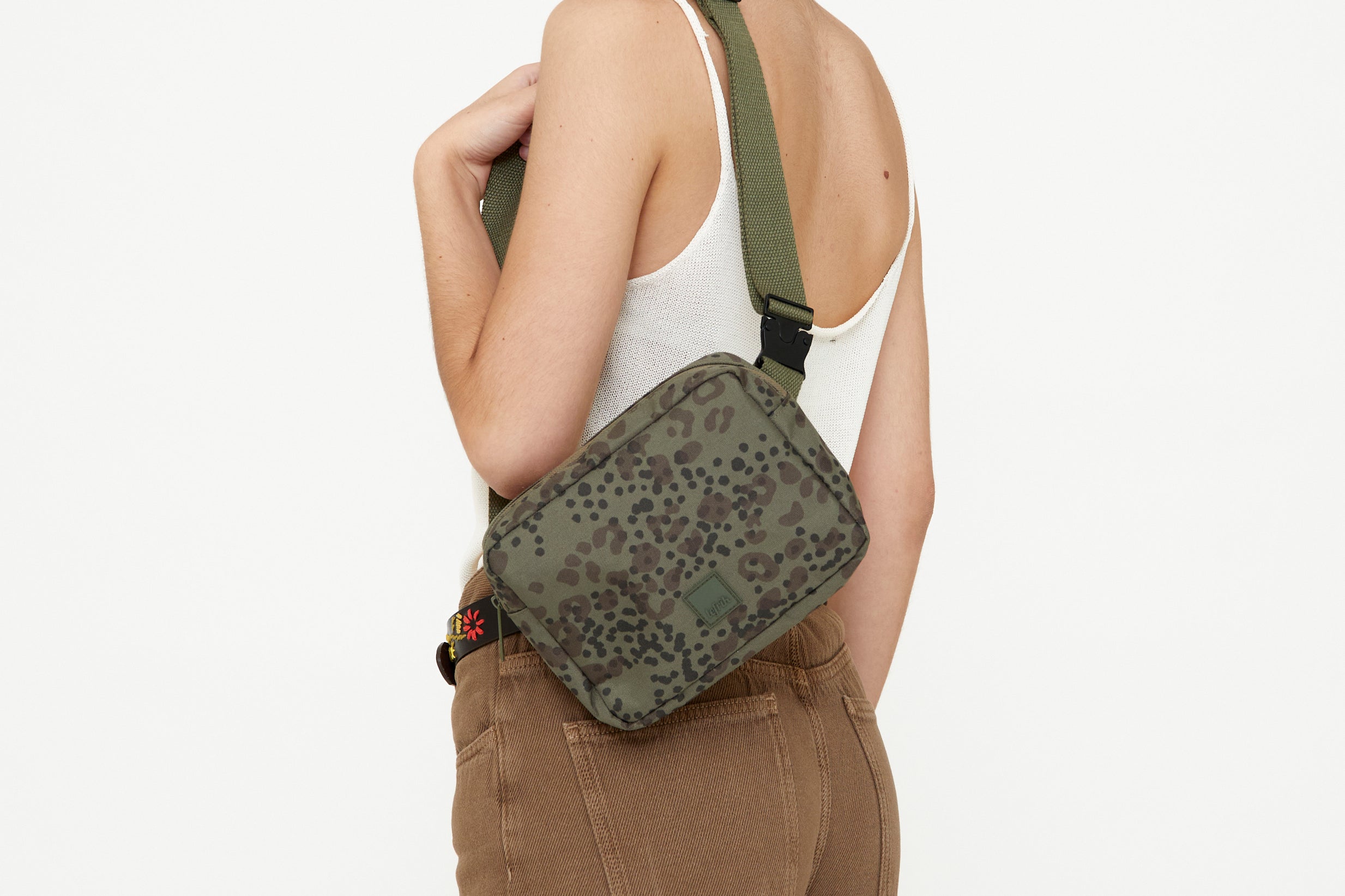 Square bum bag with an adjustable cotton strap that can also be worn as a shoulder bag. Main compartment has two interior pockets for better organization. Back zipped pocket for extra security. Metal buckle on the strap.