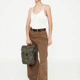 It features a quick access pocket on the flap, and a security pocket on the back. Lightweight, adjustable cotton handles.